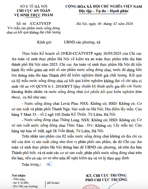 Chi cục An toàn vệ sinh thực phẩm Hà Nội phát hiện 2 mẫu nước uống đóng chai Levia Plus và Thăng Long không đạt chỉ tiêu vi sinh, đồng thời yêu cầu các địa phương rà soát, kiểm tra và xử lý theo quy định.