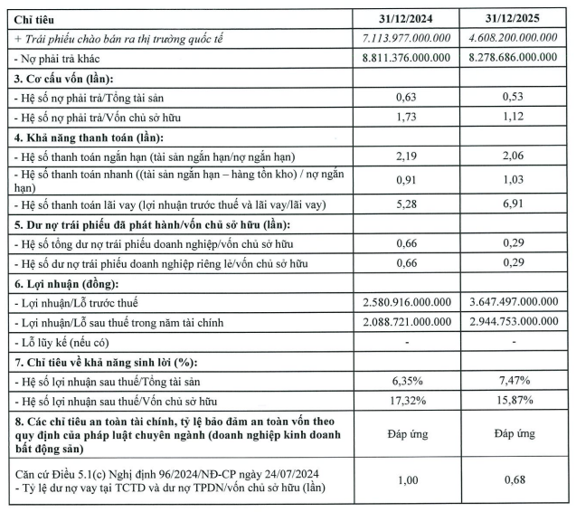 Dư nợ trái phiếu giảm mạnh từ 7.974 tỷ đồng xuống còn 5.472 tỷ đồng, trong đó trái phiếu phát hành ra thị trường quốc tế giảm từ 7.113 tỷ đồng xuống 4.608 tỷ đồng. Ngược lại, nợ vay ngân hàng tăng từ 4.023 tỷ đồng lên 7.112 tỷ đồng.