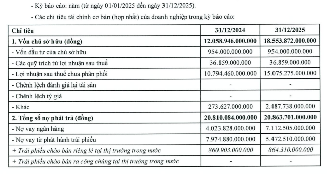 Ở phía bên kia bảng cân đối, tổng nợ phải trả của Phú Mỹ Hưng gần như đi ngang, tăng nhẹ từ 20.810 tỷ đồng cuối năm 2024 lên 20.864 tỷ đồng vào cuối năm 2025.