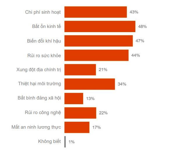 Bên cạnh những lo ngại về kinh tế, biến đổi khí hậu (47%) và rủi ro sức khỏe (44%) cũng là những mối quan tâm đáng kể.