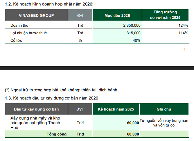 Về kế hoạch xây dựng cơ bản năm 2026, Vinaseed dự kiến đầu tư khoảng 60 tỷ đồng để xây dựng nhà máy và kho bảo quản hạt giống tại Thanh Hóa, sử dụng nguồn vốn vay trung hạn kết hợp vốn tự có.