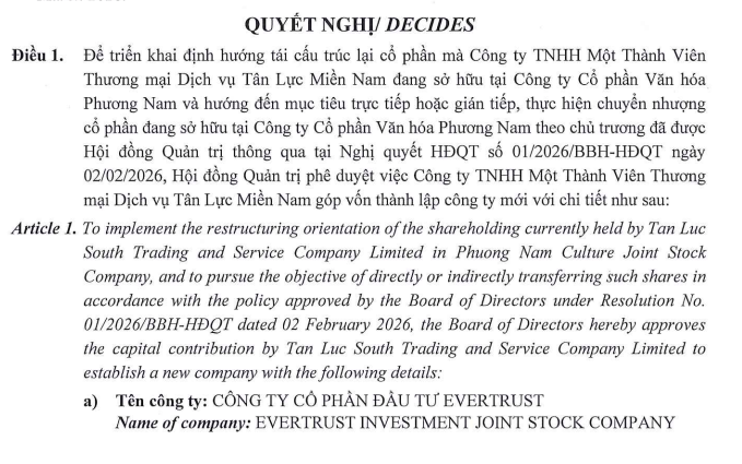Quyết định lập pháp nhân mới nhằm triển khai định hướng tái cấu trúc lại số cổ phần mà Tân Lực Miền Nam đang sở hữu tại CTCP Văn hóa Phương Nam (mã ck: PNC).