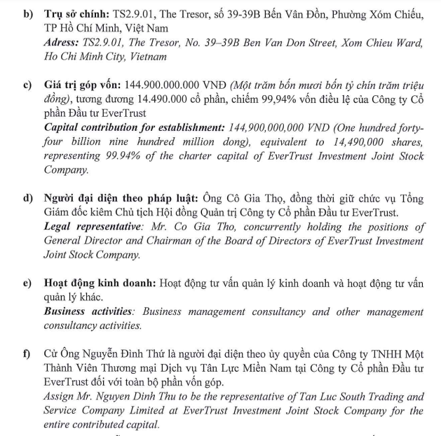 Pháp nhân mới được thành lập có tên gọi là CTCP Đầu tư EverTrust, có trụ sở chính đặt tại số 39 - 39B Bến Vân Đồn, Phường Xóm Chiếu, TP. Hồ Chí Minh. Lĩnh vực hoạt động chính của EverTrust bao gồm tư vấn quản lý kinh doanh và các hoạt động tư vấn quản lý khác.