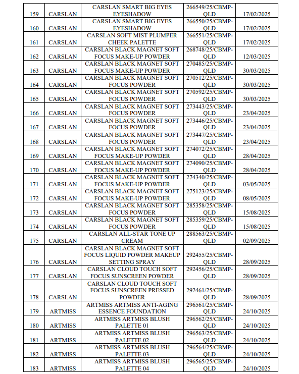 Lý do thu hồi là các doanh nghiệp đề nghị thu hồi tự nguyện do không còn nhu cầu tiếp tục kinh doanh các sản phẩm mỹ phẩm này trên thị trường. Các sản phẩm bị thu hồi trải rộng ở nhiều nhóm mỹ phẩm như chăm sóc da, trang điểm, làm sạch, chống nắng và các sản phẩm chuyên dụng khác, với thời gian cấp số tiếp nhận từ năm 2022 - 2025.