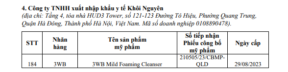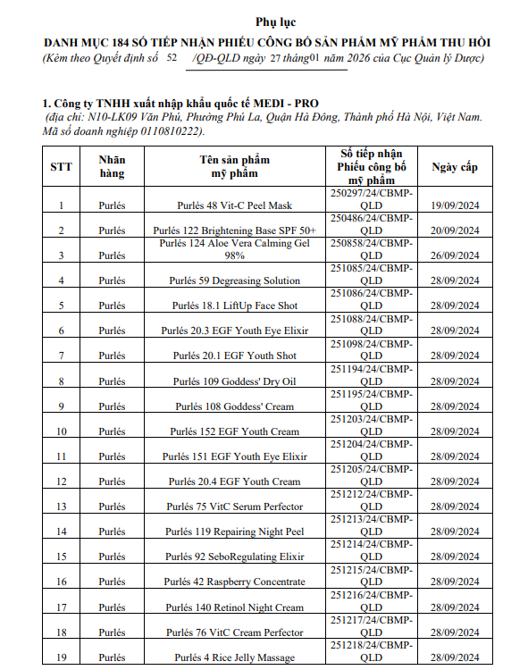 Cụ thể, Cục Quản lý Dược quyết định thu hồi 184 số tiếp nhận Phiếu công bố sản phẩm mỹ phẩm đã cấp cho các sản phẩm của 4 doanh nghiệp, gồm: Công ty TNHH xuất nhập khẩu quốc tế MEDI - PRO; Công ty TNHH Gấu Tuyết Việt Nam; Công ty TNHH Beauty Biotech Việt Nam và Công ty TNHH xuất nhập khẩu y tế Khôi Nguyên.