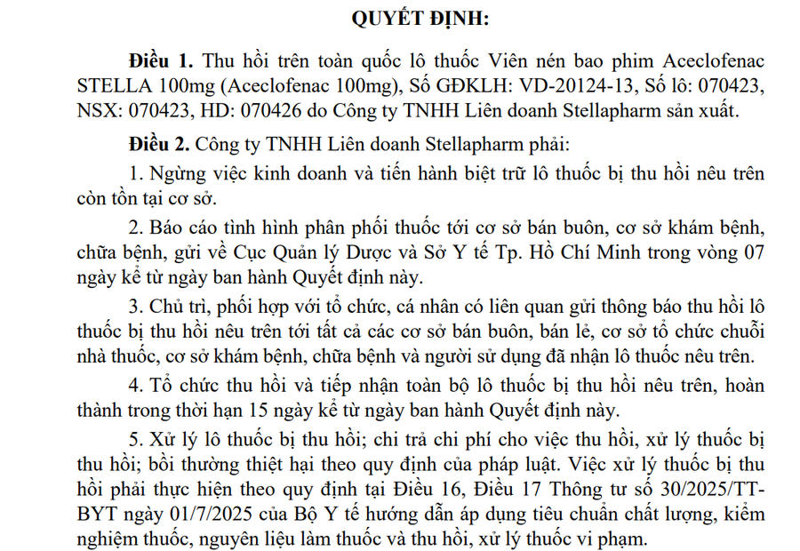 Cục Quản lý Dược yêu cầu các cơ sở kinh doanh, nhà thuốc và đơn vị y tế ngừng bán, thu hồi lô thuốc Aceclofenac STELLA 100mg không đạt chất lượng, nhằm bảo đảm an toàn cho người sử dụng và tuân thủ nghiêm các quy định về quản lý dược.