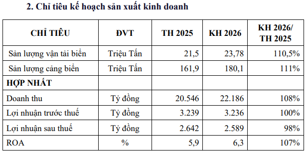 Công ty đặt mục tiêu kinh doanh năm 2026 với doanh thu 22.186 tỷ đồng, tăng 8% so với thực hiện năm 2025, trong khi chỉ tiêu lợi nhuận sau thuế dự kiến giảm 2%, xuống còn 2.589 tỷ đồng.