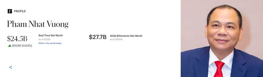Theo bảng xếp hạng Real-Time Billionaires của Forbes, tỷ phú Phạm Nhật Vượng, Chủ tịch Vingroup, hiện đứng thứ 93 trong danh sách người giàu nhất thế giới, với khối tài sản ước tính khoảng 24,5 tỷ USD.