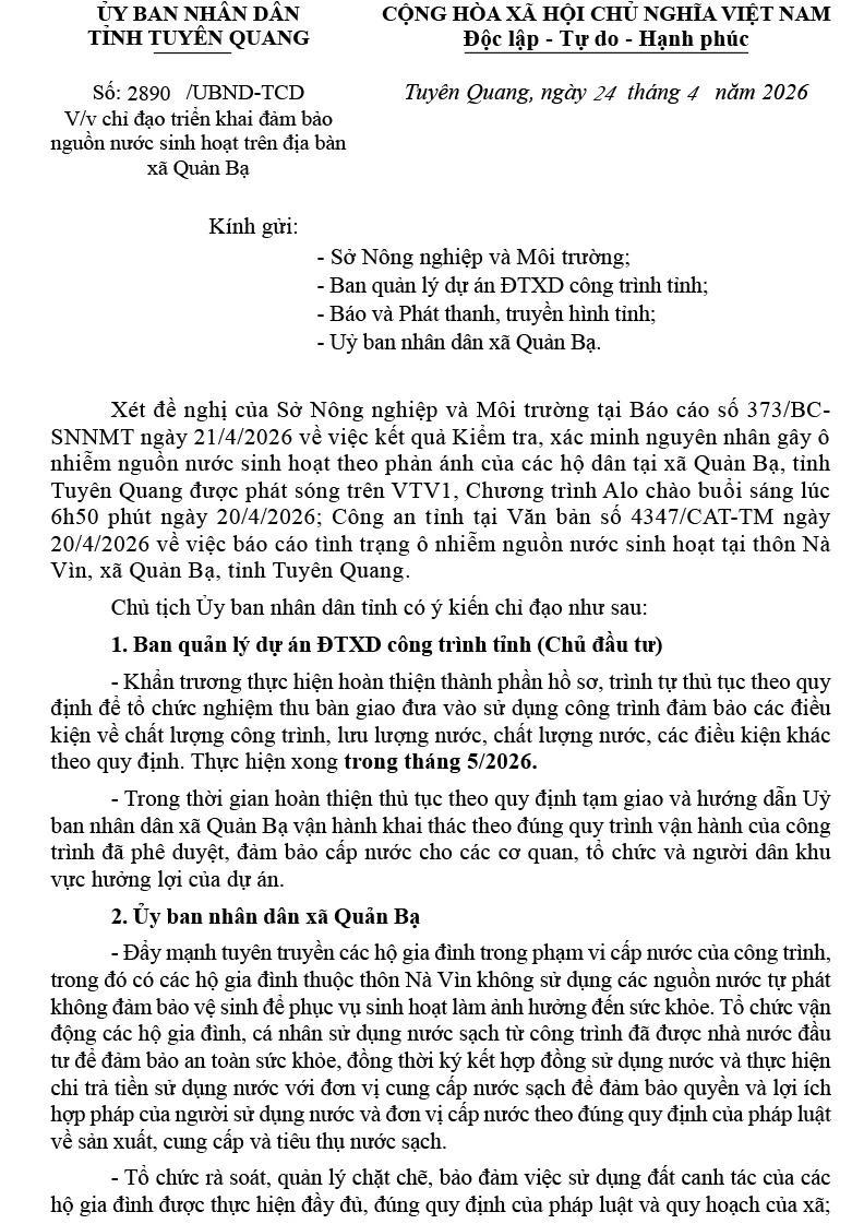 Tin90p.com - UBND tỉnh Tuyên Quang chỉ đạo sớm khắc phục tình trạng nguồn nước bị ô nhiễm