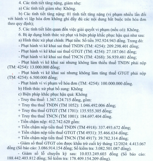 Cơ quan chức năng cũng xác định doanh nghiệp chưa tính đúng chi phí được trừ khi xác định thu nhập chịu thuế thu nhập doanh nghiệp trong các năm 2023 và 2024, dù chưa dẫn đến việc giảm số thuế phải nộp trong các kỳ này.