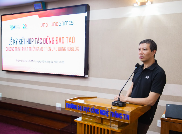 Hôm nay, với sự tiên phong của những doanh nghiệp như VNG, không chỉ trong sản xuất game mà cả trong chiến lược đào tạo nguồn nhân lực bài bản cho ngành game, bức tranh đó đang thay đổi. Thế hệ sinh viên hôm nay lần đầu tiên có thể kiếm tiền thực sự từ chính những gì mình đang học, không chỉ trong nước mà ở quy mô toàn cầu - điều mà 30 năm trước chúng tôi không dám mơ tới." Gắn chặt đào tạo với trải nghiệm thực tế UIT là trường đại học Việt Nam đầu tiên phối hợp cùng VNGGames đưa lớp học phát triển game thực chiến trên Roblox vào chương trình đào tạo chính thức. Chương trình nằm trong chuỗi hoạt động triển khai mô hình đồng đào tạo giữa VNG và UIT, thuộc khuôn khổ MOU hợp tác giữa VNG và ĐHQG TP.HCM giai đoạn 2025 - 2030 ký kết vào tháng 5/2025. ![]()